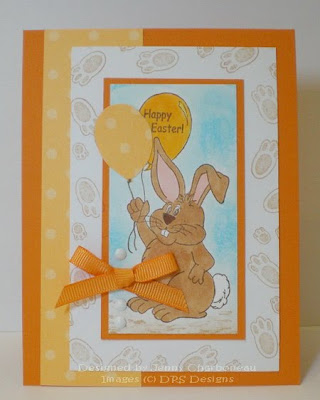 Have you ever made a card in the middle of the night because it was better than lying in bed not being able to sleep? This is what I did a couple of nights ago. And one mistake after another happened! This card was supposed to look like this: Bucky the Bunny (sneak peek) with one balloon (colored with Copic markers) and a stamped ground with Vicki's Versatile background, followed by sponging in the same color of caramel, a colored cotton tail colored with a white gel pen, a sponged sky with the scene mounted on pumpkin cs and mounted on white cs with bunny paw prints, and then finally mounted on a pumpkin card base. That's it. Maybe some ribbon.