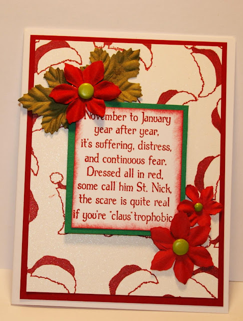 This stamp cracked me up when I saw it! I think I was the only kid that was TERRIFIED of the Jolly Fat Man... and would NOT go near him at all!!! Forget bribing me with presents, candy or any of that. I still get a little freaked at the mall...so, I can totally relate to this stamp! I stamped the Santa hat in the background and colored the top of it in with a red copic marker. Then I stamped the saying and mounted it on green... and added the poinsettias. Quick, simple and FLAT to mail! Check out the NEW RELEASE of DRS Stamps here and thanks for popping in!!!