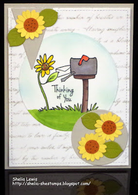 So pretty, Shelia! I love the lighter text on the bg w/ the big circle & mailbox. the little sunflowers are so pretty.