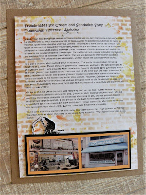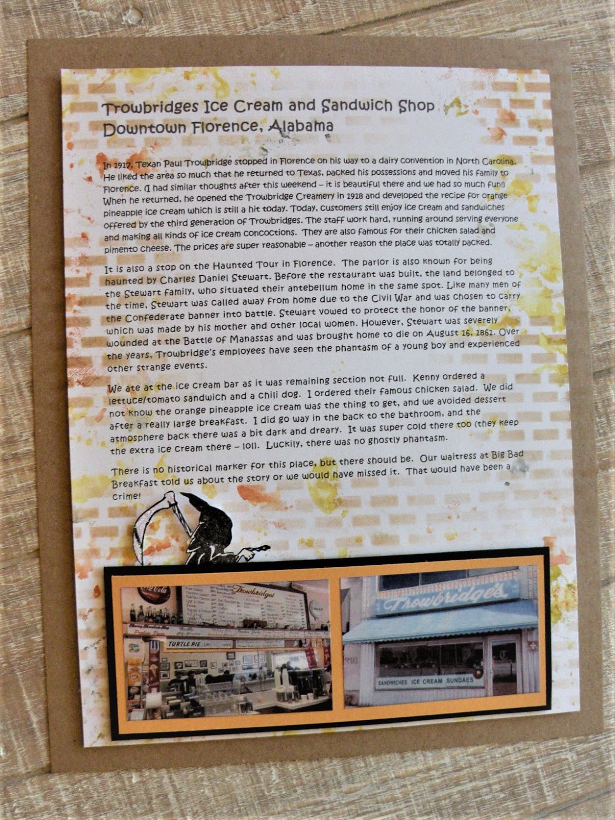 I chronicled our visit on an 8.5 by 11 page that I dipped in yellow, orange, and black ink (black for the ghost, and orange and yellow for the orange pineapple ice cream they are famous for). I added a DRS Designs Grim Reaper to signify the spooky part of the restaurant.