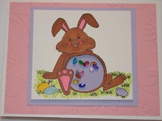 with copic markers and then I cut out the belly part. Next, I attached a small piece of acetate. Then I took the jelly bean background stamp and I stamped them with stazon on polyshrink plastic and colored them with copics. I cut them out and then I shrank them.(I LOVE watching them shrink!!!) I put them in his tummy and here is my card with jelly beans in the bunny's tummy. I knew that I just had to use the sentiment below to put on the inside of the card.! Thanks for stopping in and i hope you like this card!!!