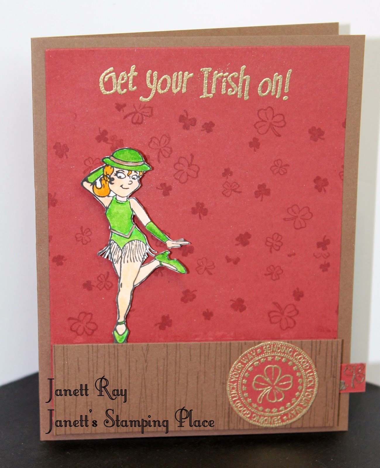 When you pull the tab that was stamped with the Shamrock Background and gold embossed the little Jazz Dancer movers across the card. the brown strip was stamped with the Wood Grain Background. and Coco ink. The Irish Good Luck Circle was gold embossed and fussy cut.
