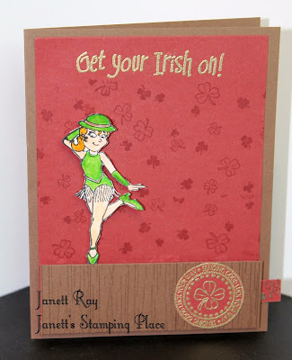 I colored and fussy cut the Jazz Dancer. For the background I stamped the Shamrock Background   with Versa Mark Ink then the Get Your Irish On was gold embossed.